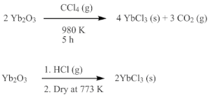 YbCl3 可由 Yb2O3與四氯化碳[6],或熱鹽酸反應製得。[7]