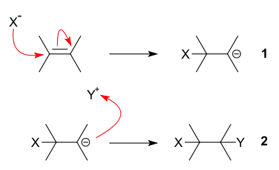 一般的烯烃不易受到亲核进攻的影响,因为碳碳双键不具有碳氧双键那样较强的极性。但如果双键所在碳上连有比较强的吸电子基团或共轭体系,则有利于反应的发生,比如阴离子聚合反应的引发步骤,和苯乙烯在甲苯中和钠反应得到1,3-二苯基丙烷。 [2]就是通过这种碳负中间体: