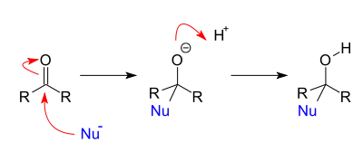 这种反应类型也称为1,2亲核加成反应。此类亲核进攻在没有其他控制因素影响下(例如存在路易斯酸和螯合剂)不会造成立体化学问题,得到的都是消旋产物。加成反应的种类很多,当加成反应还伴有消除反应称为亲核酰基取代或者加成-消除反应。