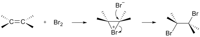 不同的机理也会产生立体选择性不同的产物。碳正离子机理得到顺式加成和反式加成产物的混合物,离子对机理得到的是顺式加成产物,而环鎓离子机理得到反式加成产物。