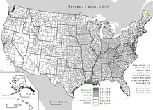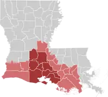 阿卡迪亚那二十二县,红色为卡津人在路易斯安那州的分布