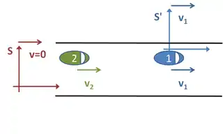 或者我們可以選擇位於第一輛車上的參考系S' 。在這個參考系裏,第一輛車是靜止的,而第二輛車跟隨在後,速度為v2 − v1 = 8 m / s。趕上前一輛車所需的時間為d /( v2 − v1) = 200 / 8 s,也就是25秒,同上。使用這個參考系比上一個參考系簡單得多。第三種做法是,取位於第二輛車上的參考系。這和以上的例子相似,但這次第二輛車為靜止,而第一輛車以每秒8米的速度向後退。