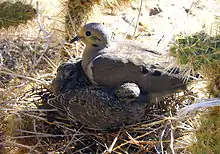 一般情况下,哀鸽每次总是产2枚蛋。[24]不过,雌鸟偶尔会把蛋产在其他哀鸽的巢中,这造成巢中容纳了3或4枚蛋。[26]哀鸽蛋又小又白,长度为2.6-3厘米,直径为2.1-2.3厘米。[21]雄鸟和雌鸟都会孵蛋,雄鸟从早晨到下午孵蛋,雌鸟则在白天余下的时间裡和夜间孵蛋。哀鸽是深爱子女的父母,它们很少把雏鸟单独留在巢中,因此一般来说,至少有一只成鸟留守巢中照料雏鸟们。[24]