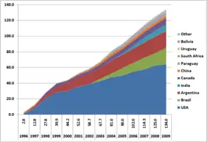 | 排名 | 国家 | 种植面积(百万公顷) | 转基因作物 |