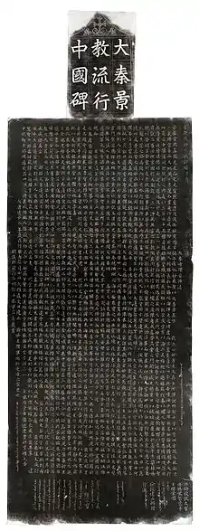 - 《大秦景教流行中国碑》:大秦國有上德曰阿羅本,占青雲而載真經,望風律以馳艱險。貞觀九祀,至扵長安。 帝使宰臣房公玄齡,惣仗西郊,賔迎入內。翻𦀰書殿,問道禁闈。深知正真,特令傳授。