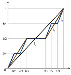 康托尔函数 c : [0,1] → [0,1] ,对于x∈[0,1],其函数值c(x)可由以下步骤得到: