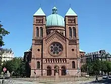 这座教堂用粉色和红色砂岩砌筑,建于1889年到1893年,德国统治时期,建筑师为Skjold Neckelmann和August Hartel,新罗曼式风格,拥有阿尔萨斯最大的穹顶(内部高度50米,最大内径十八点五米)[1].