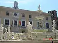 主立面三层,每层八扇窗户,在主楼层(piano nobile)有九个阳台。中央阳台下有一个浮雕,描绘了一只雄伟的大理石鹰,是萨尔瓦托·雷瓦伦蒂的作品。Over在主立面的檐口,在中央位置,有圣洛萨利亚雕像,是卡洛·德·阿普雷的作品(1661年)。[2] 在雕像下,是一口大钟,1864年从巴黎运来。在建筑的顶部,四个角装饰着四只鹰,是多梅尼科·科斯特蒂诺的作品[2]。