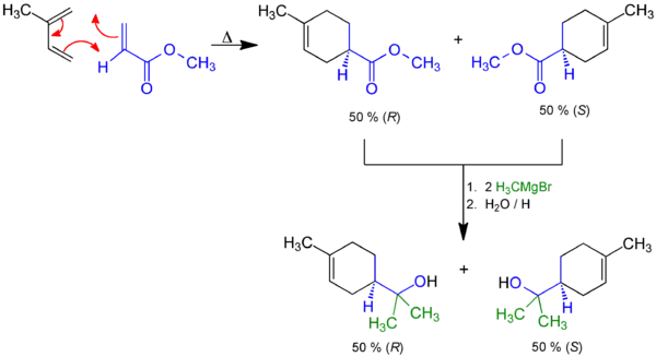 外消旋α-松油醇可以通过用异戊二烯与丙烯酸甲酯发生Diels-Alder反应生成外消旋4-甲基-3-环己烯-1-羧酸甲酯,再用格氏试剂甲基溴化镁处理、并水解而制得。