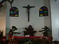 內部的聖體櫃由原木雕刻,和同樣木材製作的祭台互相輝映。左邊設有著清朝官服的中華聖母態像,是中華聖母修女會來台時自中國大陸攜來的。右邊則是聖若瑟態像。教堂右邊穿堂有台灣雕塑家楊英風先生創作的萬應聖母態像。而教堂後方小山丘上則有耶穌十四苦路的主題布置,並以聖經典故命名為「山園」。[4]