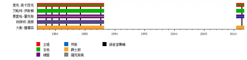 - 葛雷格·霍克斯 – 鍵盤、吉他、薩克斯風、背景和聲 (1976-1988、2010-2011)