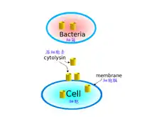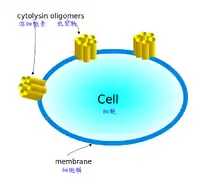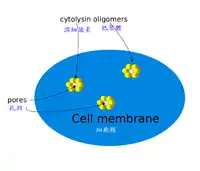 - 在靶細胞膜上造出孔洞的溶細胞素。這類溶細胞素亦被稱爲「成孔毒素」(pore-forming toxin,縮寫PTF)。大部分溶細胞素都是成孔毒素。典型的成孔毒素有氣莢膜梭菌分泌的perfringiolysin O、大腸桿菌分泌的溶血素、李斯特菌分泌的李斯特菌毒素。成孔毒素的作用範圍很廣,從一般的細胞膜,到一些比較特殊的組織,比如膽固醇和巨噬細胞的膜[6]。