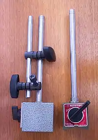 磁性底座,一般用於量測儀器的固定,一般性量測儀器如千分表、角度規、震動計等,多半使用磁性座固定量具。