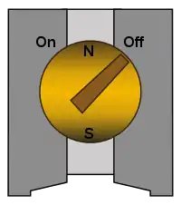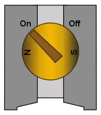 磁性底座外殼是兩塊鐵,中間圓形永久磁鐵,可方便地旋轉的磁鐵。可吸附在導磁性佳的鐵材上面。