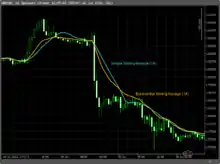 指數移動平均(英語:,EMA或EXMA)是以指數式遞減加權的移動平均。各數值的加權影響力隨時間而指數式遞減,越近期的數據加權影響力越重,但較舊的數據也給予一定的加權值。右圖是一例子。