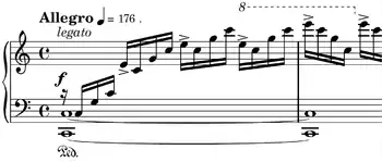 右手部分的琶音是基於十度和弦,音域廣達六個八度:左手部分為緩慢的八度旋律。此曲的困難之處在於右手轉換位置時樂段依然連續。