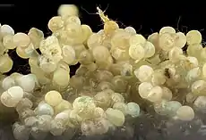 草地貪夜蛾的卵呈圓頂狀,直徑約為4毫米,高約3毫米[4],有時被絨毛狀的分泌物覆蓋,剛產下的卵呈綠灰色,12小時後轉為棕色,孵化前則接近黑色,環境適宜時卵四天後即可孵化[11]。雌蟲通常在葉片的下表面產卵,族群稠密時則會產卵於植物的任何部位[5]。