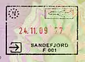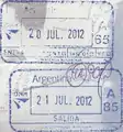 瑞典護照上的聖皮埃爾 (馬提尼克)海關入境(上)與出境(下)印章。截至2016年3月,聖皮埃爾在法蘭西堡港蓋章。