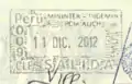紐西蘭護照上的秘魯利馬機場出境印章,底部為英國入境印章的一部分,右側為智利印章的一部分。