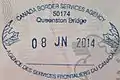 加拿大邊境服務局在安大略省哈密爾頓約翰·卡爾·芒羅哈密爾頓國際機場的入境印章。