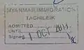 仰光國際機場的入境(左)與出境印章,此為使用傳統黏貼式簽證的旅客。