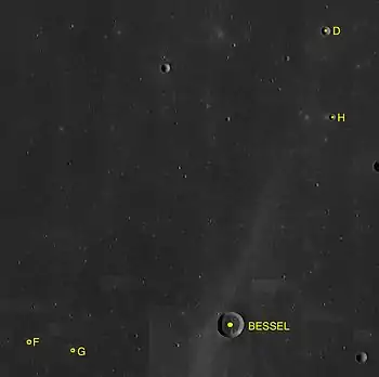 贝塞尔陨石坑(Bessel)是月球正面位于澄海中部的一座小撞击坑,约形成于32-11亿年前的爱拉托逊纪[1],1834年德国天文学家约翰·海因里希·冯·马德勒曾对它进行过描述。该陨石坑的名称取自十九世纪德国数学家暨天文学家,坚信月球上没有大气层和生命的"弗里德里希·威廉·贝塞尔"(1784年-1846年),1935年被国际天文学联合会批准接受[2]。