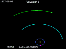 至2018年10月18日,旅行者1号距离太阳213.7亿公里(144.1天文单位),目前位于星际空间中,是距离地球最远的人造物体。它在经过木星和土星时通过重力助推获得了足以完全摆脱太阳引力的动能。[9]