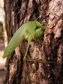 The Phaneropterinae are largely arboreal in habitat.[2] The vast majority of species live in shrubs and trees, feeding on leaves and twigs.[2] Some species might potentially cause significant damage, though usually superficial, when present in large numbers, but this is rare; they usually are solitary, unlike 蝗科, so much so that they seldom come to human notice.[2]