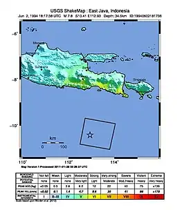 1994年爪哇地震是指1994年6月3日发生于印度尼西亚爪哇岛南部近海的强烈地震。该次地震震中位于南纬10.477度,东经112.835度,震级为MW 7.8级,震源深度约为18.4千米,最大烈度为6(VI)度[1][3]。该次地震引发了一场最高高度为13.9米的巨大海啸,共造成238人遇难和423人受伤[5]。该次地震已被美国地质调查局列入1994年显著地震列表[6]。