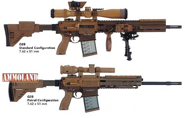HK G28是由HK417的民用比賽型步槍MR308發展改進而來的衍生型,採用半自動方式,仍然發射7.62×51毫米北約口徑制式步枪子彈。HK417與傳統的德製單兵槍械不同,具有典型的美製AR系槍械血統。