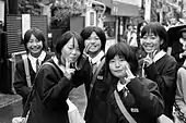 手掌朝外的V字手勢在日本經常用於非正式場合的拍照中,尤其年輕人間更是如此。一說認為這習俗是受1972年冬季奥林匹克运动会時美國花式溜冰選手珍妮特‧琳恩(Janet Lynn)的影響而來的,當時珍妮特‧琳恩在進行自由滑冰的階段(free-skate period)的時候曾一度滑倒,但即便她坐在冰塊上,她依舊繼續保持著微笑。雖然最後珍妮特‧琳恩得到第三名,但她開朗的努力行徑,卻引起了許多日本人的共鳴,琳恩在一夜之間成了日本的外國偶像。做為和平主義運動者,琳恩在接受日本媒體採訪時經常比出V字手勢。儘管在二戰結束後盟軍佔領日本的期間,日本人就已知此V字手勢,但一些日本人認為琳恩是導致V字手勢自1970年代起在日本開始流行的原因[11]。